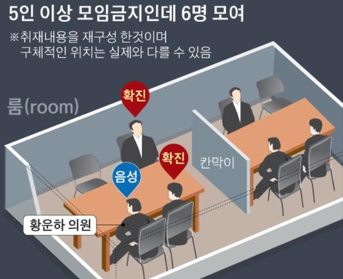 황운하 의원, 염홍철 전 대전시장 등 6명은 대전 중구의 한 식당에서 저녁 7시부터 9시까지 저녁식사를 했습니다. 이들이 식사를 한 공간은 룸이었는데요. 해당 룸안에는 두 개의 테이블이 있었다고 합니다.